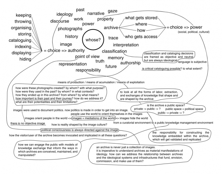 This invisible intervention – opaque even to the project team – is completed by a diagram inserted into the exhibition space, whose aim is to bring into discussion a series of questions that extend the task of researching the images, siting it in a (self-)interrogative zone: Who took the photographs? When? In what context? What was their purpose? What journey have they made? Who owns the photographs now? Who uses them? To what end? What part does the viewer/user play and how is she interpellated by such questions? Can the archive be a public space? By the fact that they are visible to visitors and users, such questions are intended to stimulate ongoing debate about the role of the image, bringing critical reflection to the space of the archive.